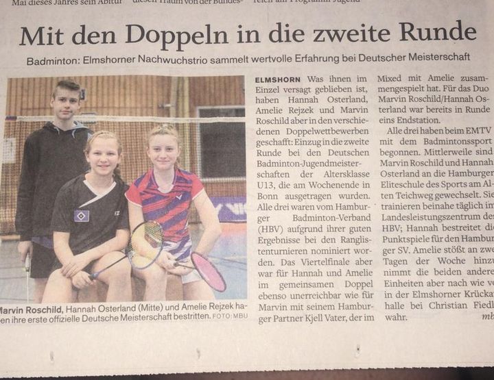 Zweimal konnte sie die zweite Hauptrunde erreichen, im Mixed mit Kjell gewann sie das Erstrundenspiel. Im Dppel waren Hannah und Amelie als gesetzte Paarung schon in Runde zwei, unterlagen dort aber knapp dem Refrather Doppel.