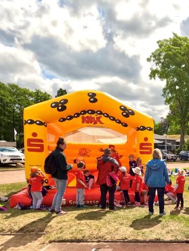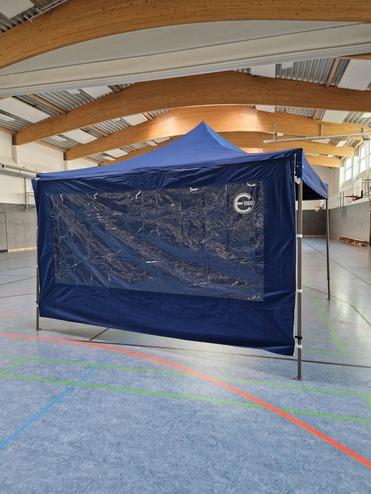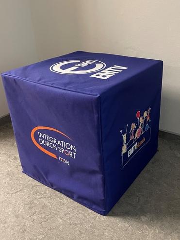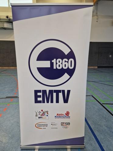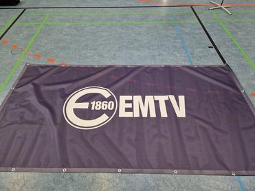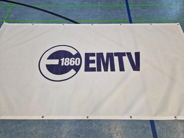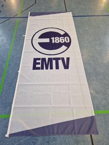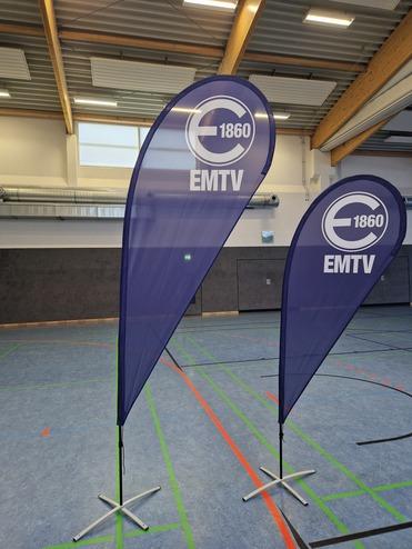 Im Bestand sind Rollups, Beachflags, Banner, Flaggen, Kundenstopper, ein Pavillon, Sitzwürfel, eine Pressewand, ein Messetisch und vieles mehr mit EMTV-Aufdruck. Perfekt um den EMTV auf einem Event sichtbar zu machen.