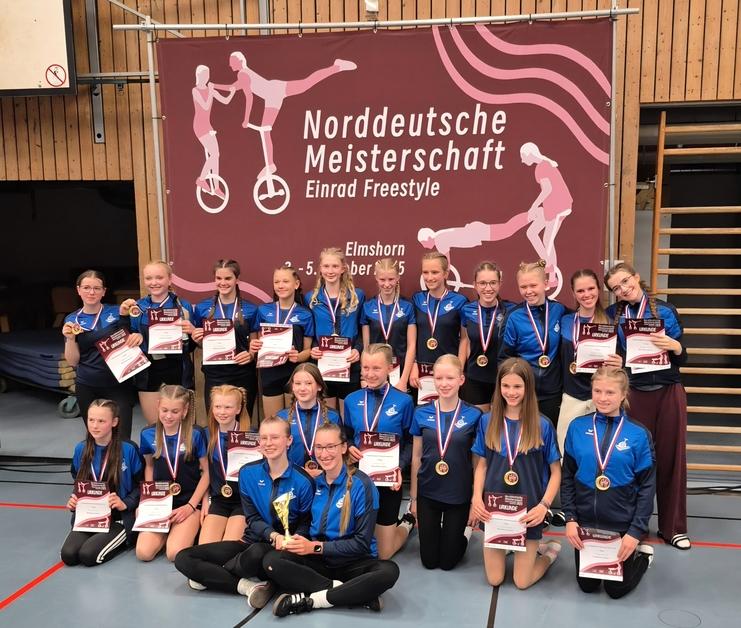 Wir gratulieren von Herzen Laura und Milena von der Einradabteilung des Elmshorner MTVs. Sie wurden mit ihrem Juniorkader Schleswig-Holstein auf der Norddeutschen Meisterschaft, 03. bis 05. Oktober 2025, Elmshorn, Landesmeister! Ihre Sportlerinnen, darunter auch Johanna vom EMTV, präsentierten eine großartige und spannende Kür mit bemerkenswert hohem Trickniveau mit dem Titel 'Revolting children'. Im November geht es zur Deutschen Meisterschaft nach Bottrop, Nordrhein-Westfalen.