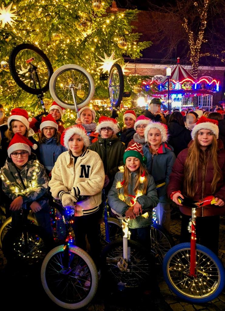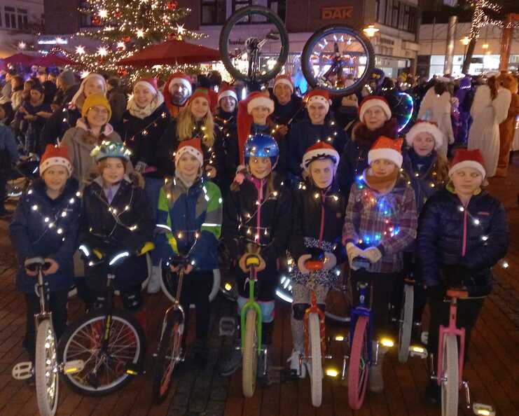 In Lichterglanz und unter stimmungsvoller Musik radeln die Einradler am Freitag, den 11.12.2025, im Umzug der Elmshorner Weihnachtsparade durch die Stadt.