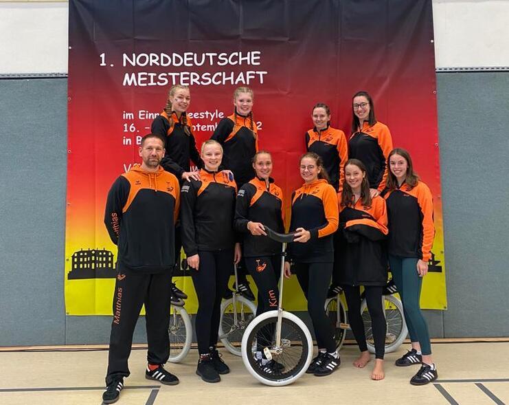 Wir gratulieren von Herzen Laura und Milena von der Einradabteilung des Elmshorner MTVs. Sie wurden mit ihrem Juniorkader Schleswig-Holstein auf der Norddeutschen Meisterschaft, 03. bis 05. Oktober 2025, Elmshorn, Landesmeister! Ihre Sportlerinnen, darunter auch Johanna vom EMTV, präsentierten eine großartige und spannende Kür mit bemerkenswert hohem Trickniveau mit dem Titel 'Revolting children'. Im November geht es zur Deutschen Meisterschaft nach Bottrop, Nordrhein-Westfalen.