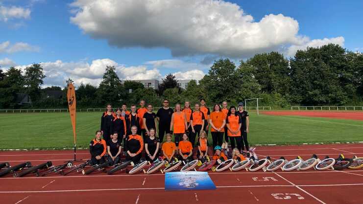 Elf Einradler aus Schleswig-Holstein, darunter drei Einradler vom EMTV, auf der Deutschen Meisterschaft im Einradbahnrennen, 13. und 14. September 2025, in Bottrop, Nordrhein-Westfalen.
