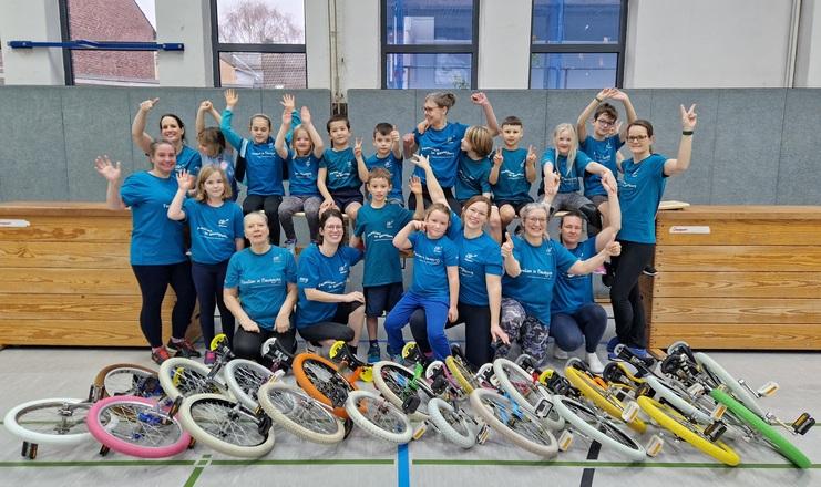 Kinder und Eltern erlernen zusammen das Einradfahren. Wer schafft es zu erst, eine Runde durch die Halle zu drehen? Mit viel Spaß an der gemeinsamen Bewegung und unter professioneller Anleitung von Trainerin Andrea ist der LSV-Kurs "Familien in Bewegung" wie immer sehr gut besucht.