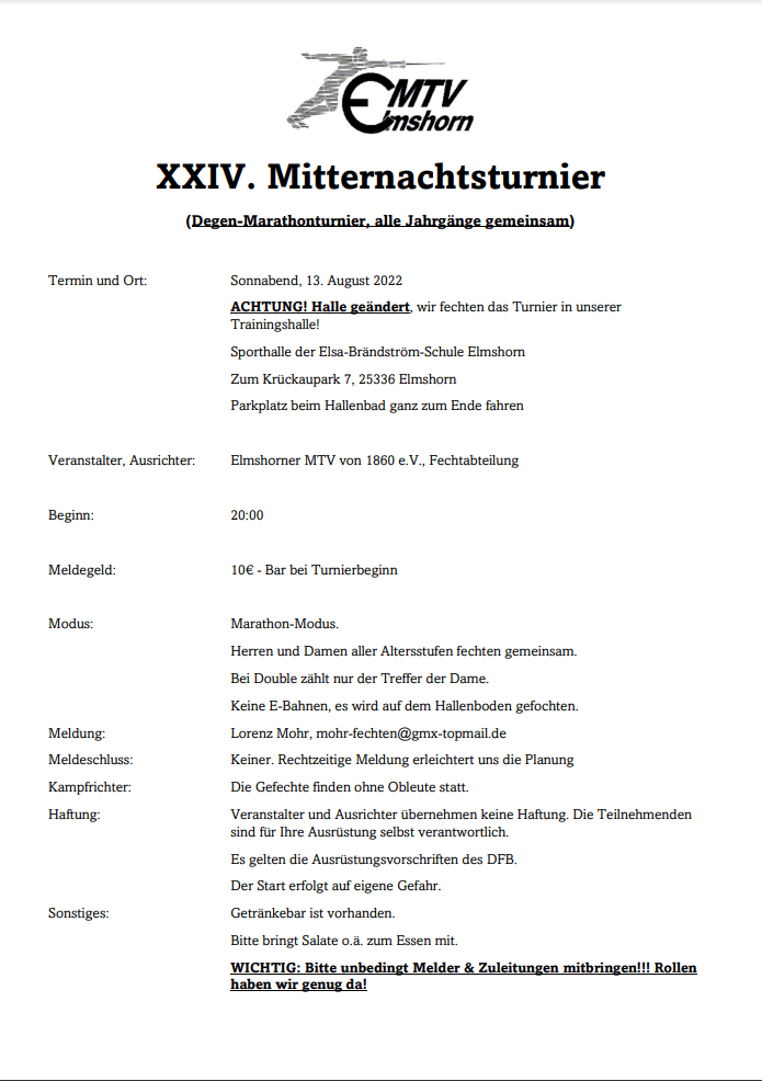 Nach erzwungener Corona-Pause kann unser zweites Traditionsturnier wieder stattfinden. Beim Mitternachtsturnier wird im Marathon-Modus gefochten, jeder fechtet also gegen jeden Teilnehmer und so wird der Sieger ermittelt.