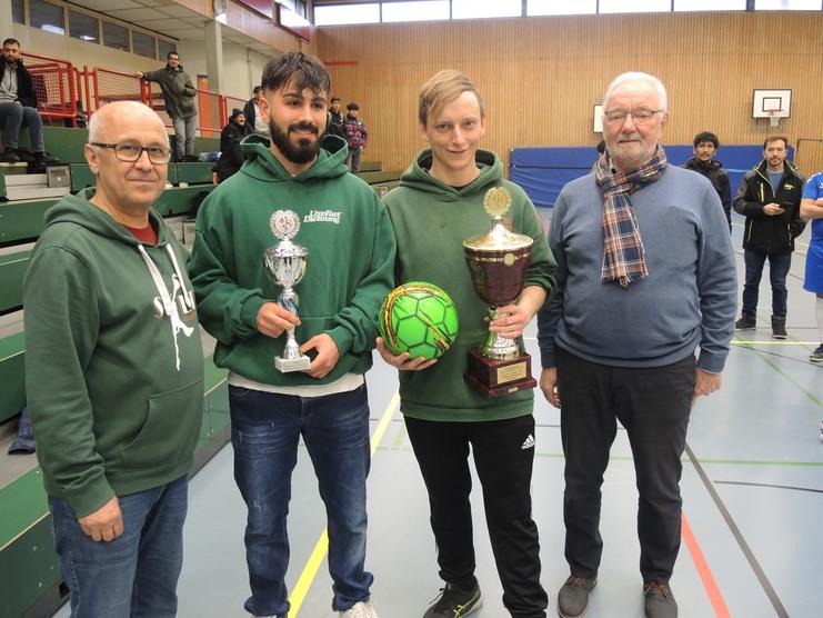 Sieger wurde das Team Mitternachtssport B - (v.l.) Mehmet Karakavak (Integrationsbeauftrager EMTV), Deniz Duman (Kapitän Team Mitternachtssport B), Kevin Meyer (Trainer Mitternachtssport), Frank Dentler (Vors. vom Willkommensteam)