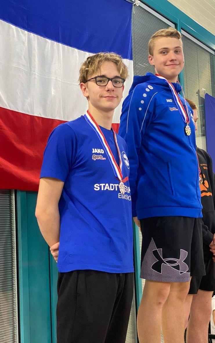 Beim ersten Entscheidungswettkampf über die 400m Freistil gab es gleich zwei Schwimmer vom EMTV auf dem Siegerpodest. Johannes Liebmann (Jahrgang 2007) wurde Jahrgangsmeister und Kolja Dieckmann belegte Platz 2. Gleichzeitig wurde Johannes mit der Zeit in der offenen Klasse SHSV – Meister, gefolgt von Kolja Dieckmann auf Platz 2.