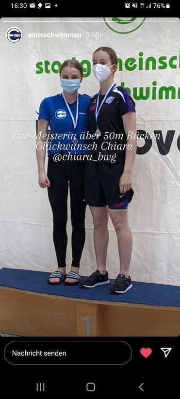 Platz 2 über 100 m Schmetterling, Platz 3 über 50m Brust, Platz 2 über 100 und 200 m Brust . Mette Tschirner aus dem gleichen Jahrgang errang