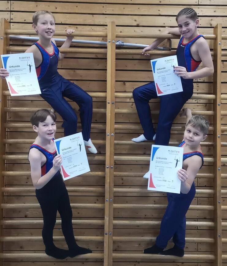 Die Turner der Jahrgänge 2013 und 2014 – Lasse Siebold, Thore Hopf, Vincent Bülck und Sam Pawletta – mussten nach ihrem Mannschaftseinsatz in der Schleswig-Holsteinischen Schüler-Turnliga zunächst wieder auf die P-Stufen-Übungen umstellen. Diese Herausforderung meisterten sie mit Bravour. Vincent und Lasse glänzten am Sprung (14,7 bzw. 14,5 Punkte), während Thore und Sam ihre Stärken am Boden zeigten (13,6 bzw. 13,7 Punkte).