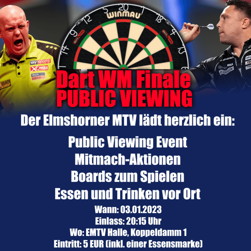 Der Elmshorner MTV lädt ganz herzlich ein, am 03.01.2023 in der EMTV-Sporthalle am Koppeldamm das diesjährige Finale der Darts-Weltmeisterschaft live mitzuverfolgen.