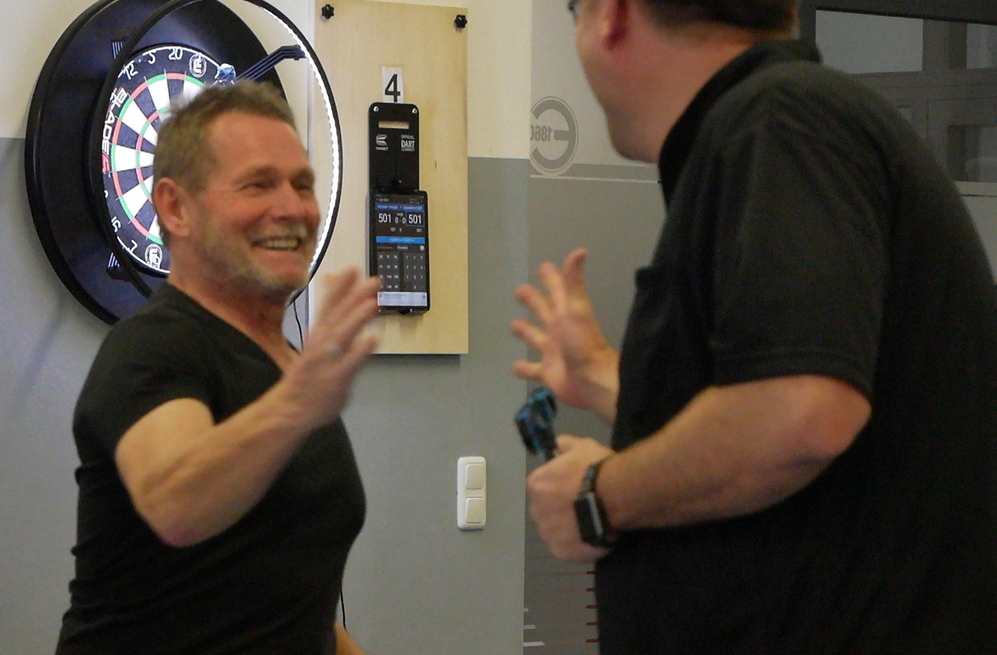 Foto: Rüdiger Weide (links) und Martin Tuszynski (rechts) verwandeln als Doppel die Matchdarts